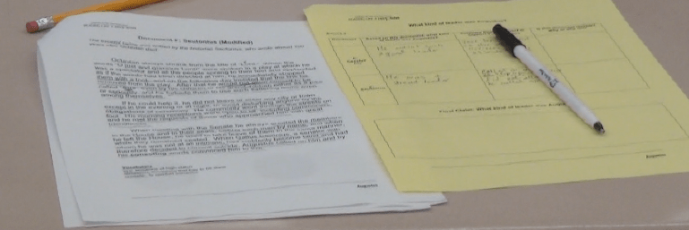 Providing practice and rubric-based feedback helped students to improve. The first time through, using SHEG’s Augustus activity, we emphasized using and citing evidence and discussed sourcing. A strong majority of students (32/41) used evidence proficiently or better by supporting their claim about Augustus’s leadership with two pieces of evidence. But, despite some quality small- and large-group discussion during the activity about the impact of sourcing on the documents, far fewer students were proficient at the higher order task (4/41). This fits my previous observation that it’s hard. I recorded grades based almost solely on student use of evidence, since this was focus of instruction for the task.